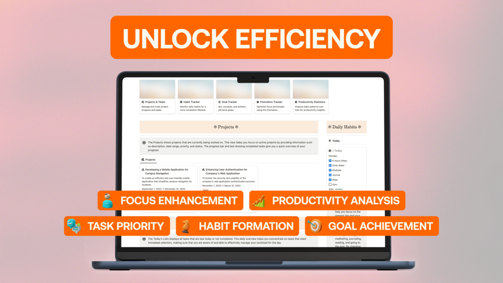 You'll get the Ultimate Productivity System, your all-encompassing dashboard for task management, habit tracking, goal setting, using the Pomodoro technique, and analyzing productivity patterns to maximize your efficiency.
