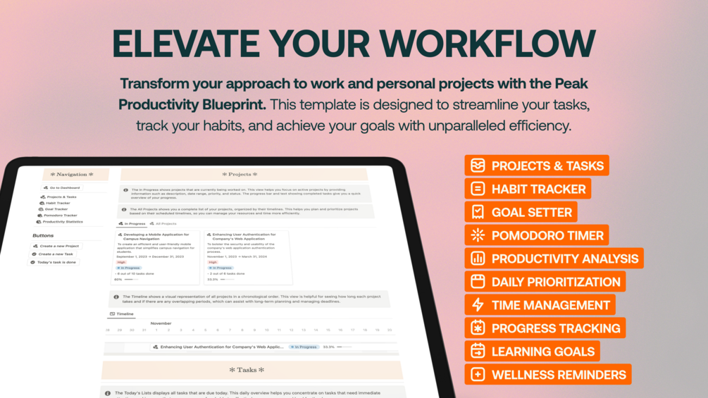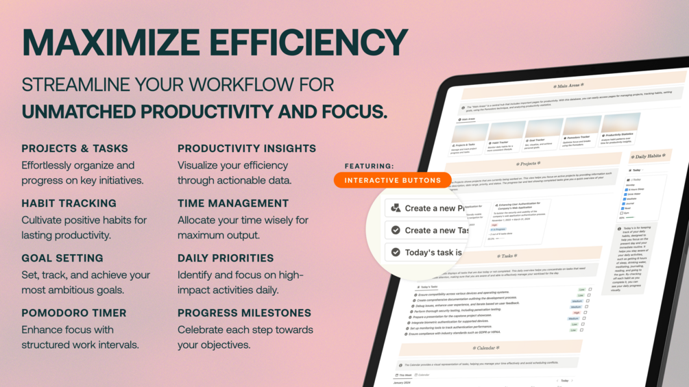 You'll get the Ultimate Productivity System, your all-encompassing dashboard for task management, habit tracking, goal setting, using the Pomodoro technique, and analyzing productivity patterns to maximize your efficiency.
